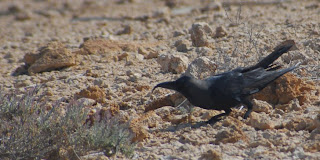 São gralhas-somalis (Corvus edithae), e o primeiro animal observado, mais não tem que uma mal formação… tão bem formada que num primeiro momento não levanta a menor suspeita. De resto, em Portugal, já havia observado duas cegonhas-brancas com problemas semelhantes. Não deverá ser nada prático para aquele indivíduo, que apanha os seus alimentos de lado e não de frente, mas o que é certo é que parece conseguir viver bem – ou, pelo menos, alimentar-se - com o seu problema.
